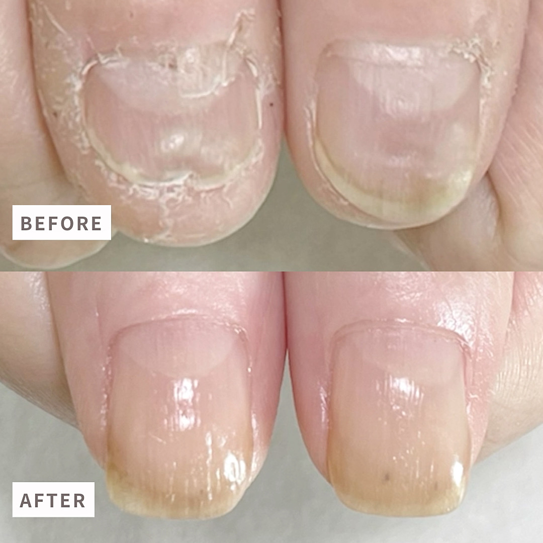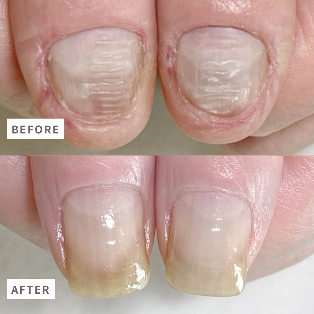 当店の自爪育成では、二枚爪、薄い爪、弱い爪、割れ爪、欠け爪なども、縦爪に伸ばすだけでなく、同時に「強度のある爪」に育成することが可能です。